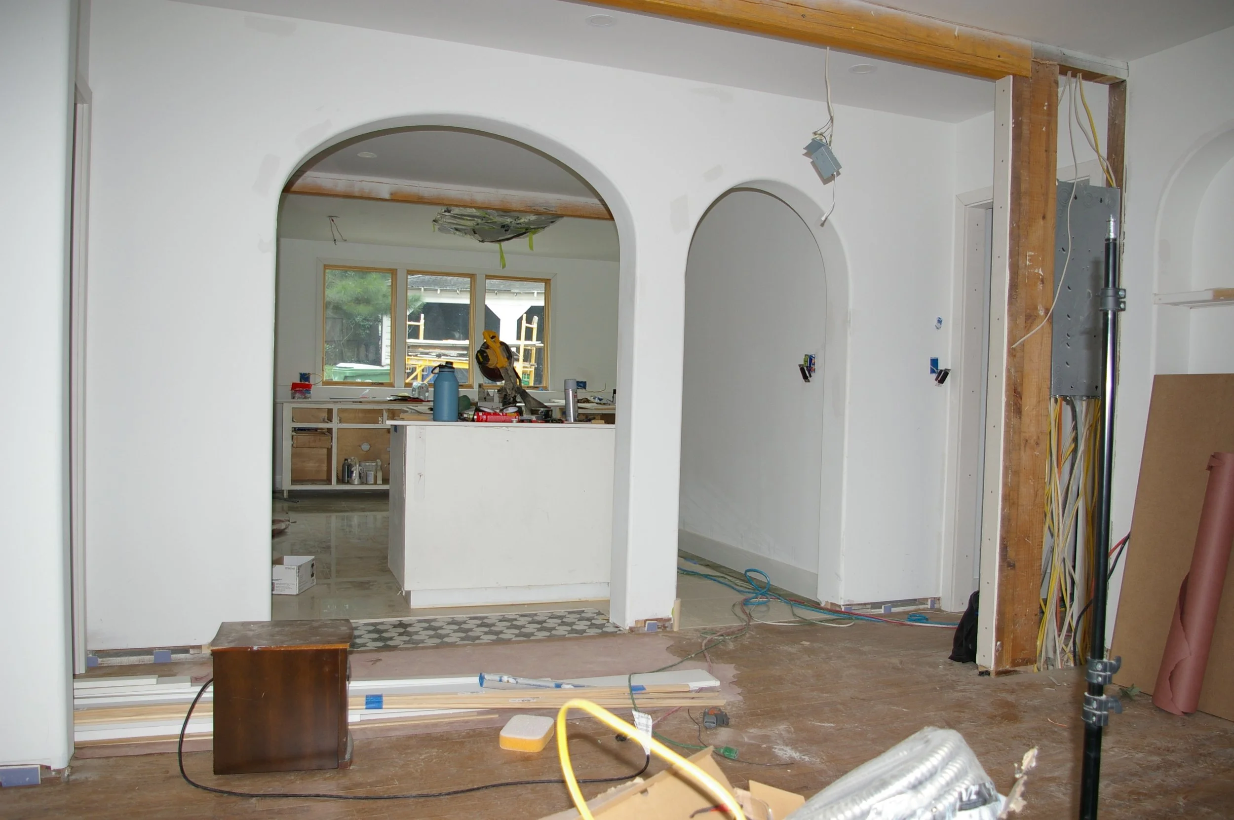 The big design idea was the removal of an enclosed stair to the attic that visually separated the Living Room and Kitchen. The existing single Bathroom was expanded slightly to become a more spacious Master Bathroom, and a new combined Bathroom/Laundry Room was created for guests and children. The smaller Bedroom was converted to an office/future Nursery and is connected to the Master Bedroom with a concealed door. The Kitchen was reconfigured to provide a more functional layout within the existing footprint, and a separate Dining area completed the composition. A number of new windows were added or expanded in size to take advantage of views to the yard and the skyline of downtown Atlanta.